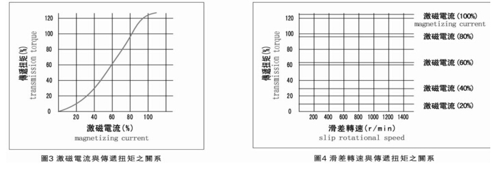 磁粉式离合器(电磁粉末式离合器)激磁电流与转矩的关系,及滑差转速与转矩的关系如下图: